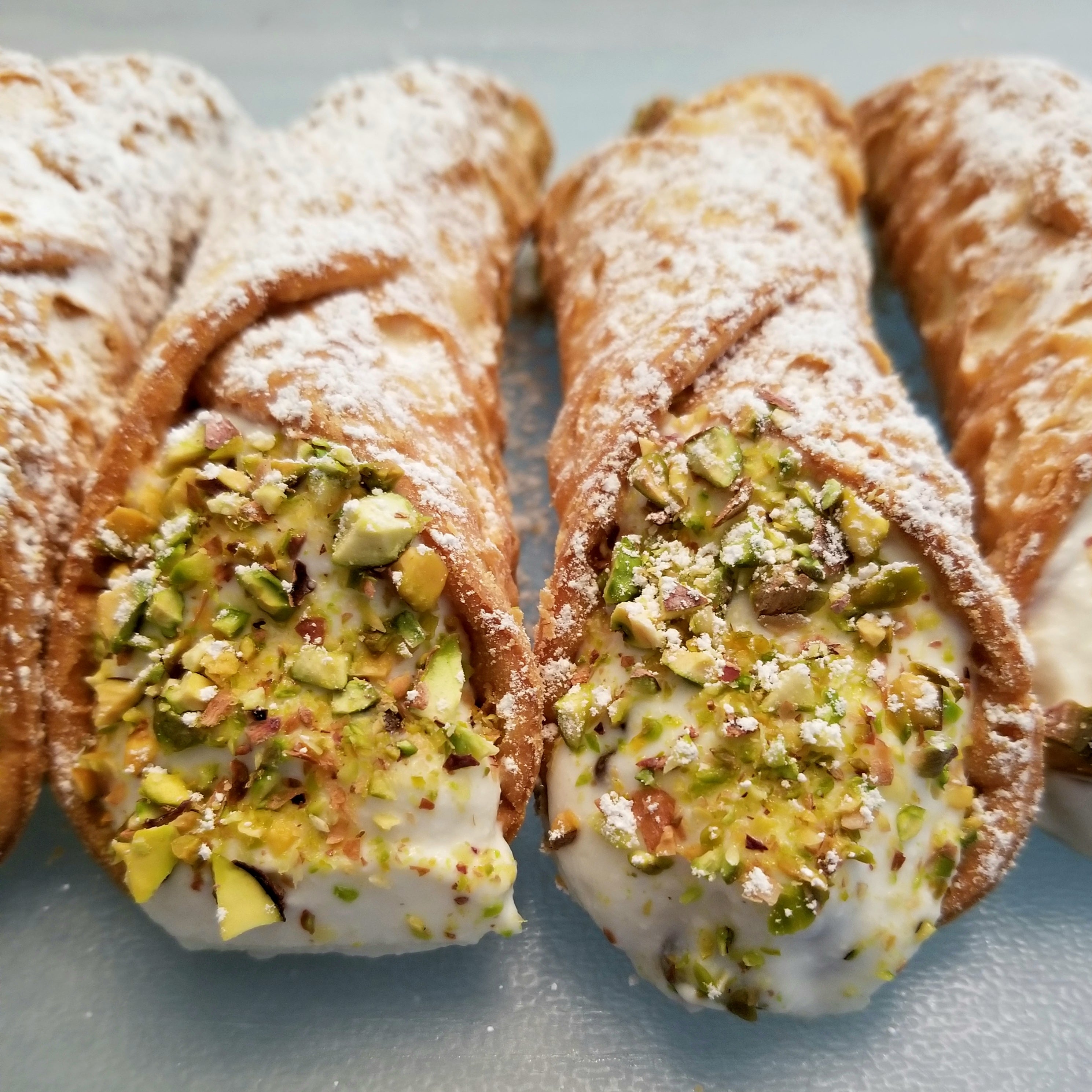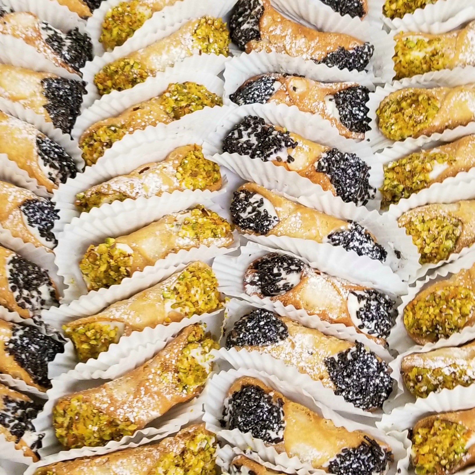 Our customers' favorite dessert. Authentic Sicilian cannolis with a crusty shell, filled with Italian cheese, topped with the topping of your choice and dusted with powder sugar.